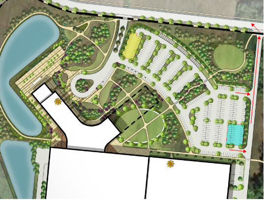 Parking in the company parking lot. The yellow highlighted section will be dedicated to the 5K guests, you can also park throughout the parking lot as well. DO NOT drive in the main/vistitor parking lot and turn around.